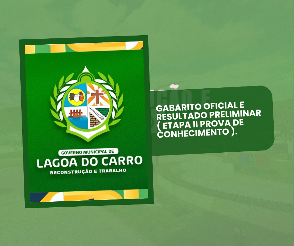 A Secretaria Municipal de Educação de Lagoa do Carro/PE, por intermédio da Comissão Coordenadora, instituida pelo Decreto Municipal nº 053/2025, torna público o RESULTADO DA ETAPA II (PROVA DE CONHECIMENTOS), tendo em vista a transparência e continuidade das etapas do processo de seleção, com base no cronograma divulgado no edital. Baixar o Arquivo documento
